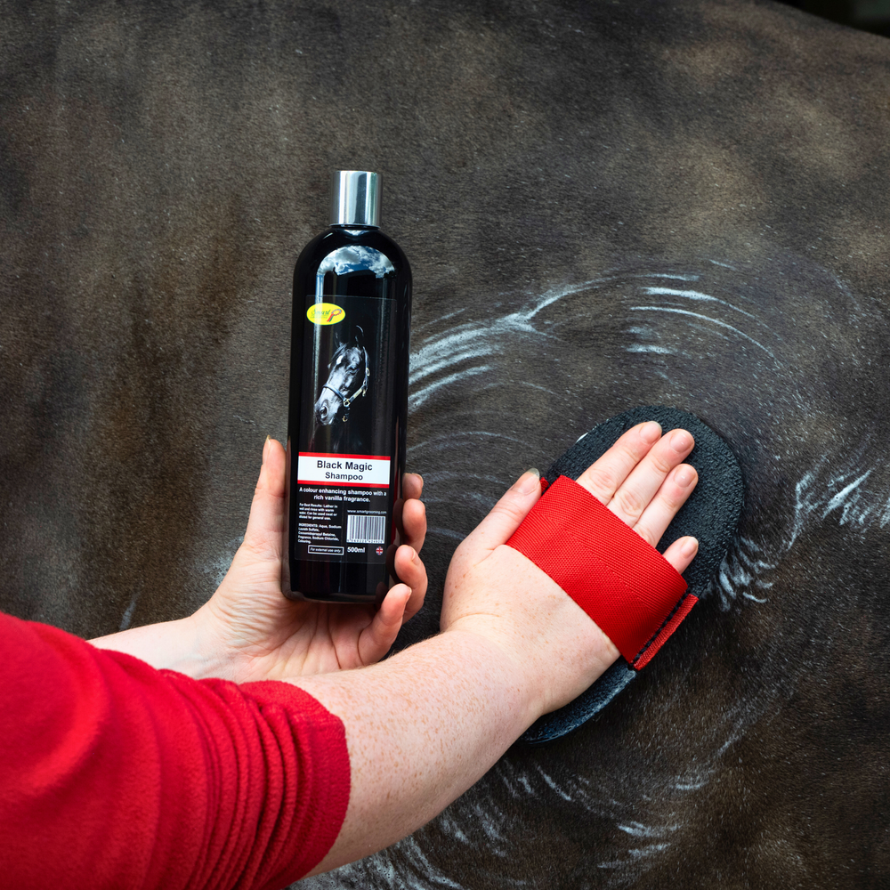 • If your horse is muddy and has thick hair, use a coarse brush first. For sensitive or fine coated horses, use the Super Groomer to remove thick mud. The next stage is to go over the entire horse’s body with a medium grade of brush such as the Borstiq Mex Fibre. This brush with its natural fibre bristles will really get into the hair.  Then move onto a closer bristled brush such as a traditional Body Brush.  With this brush you will be able to groom even further into the coat but remember to clean your brush every other stroke with a metal curry comb.  Whilst going through the grooming routine, you will be able feel for any lumps or bumps or new injuries.   Moving on to the head and sensitive areas, use a soft brush, such as a Goat Hair.  This is a super soft natural grooming brush and will give a gentle feel to the vulnerable areas as well as being an enjoying part of the grooming process.  For the final finish to the body area, use the Borstiq Mex Soft or Borstiq Soft Finishing Brush, these will polish the fur to give a soft sheen.  Use a damp cloth for wiping over the eyes and nose and under the tail.  For added condition and shine, spray in Coat Sheen and polish in with our Black fleece mitt.  For a high show shine finish use Gloss n Go and polish in with the fleece mitt.