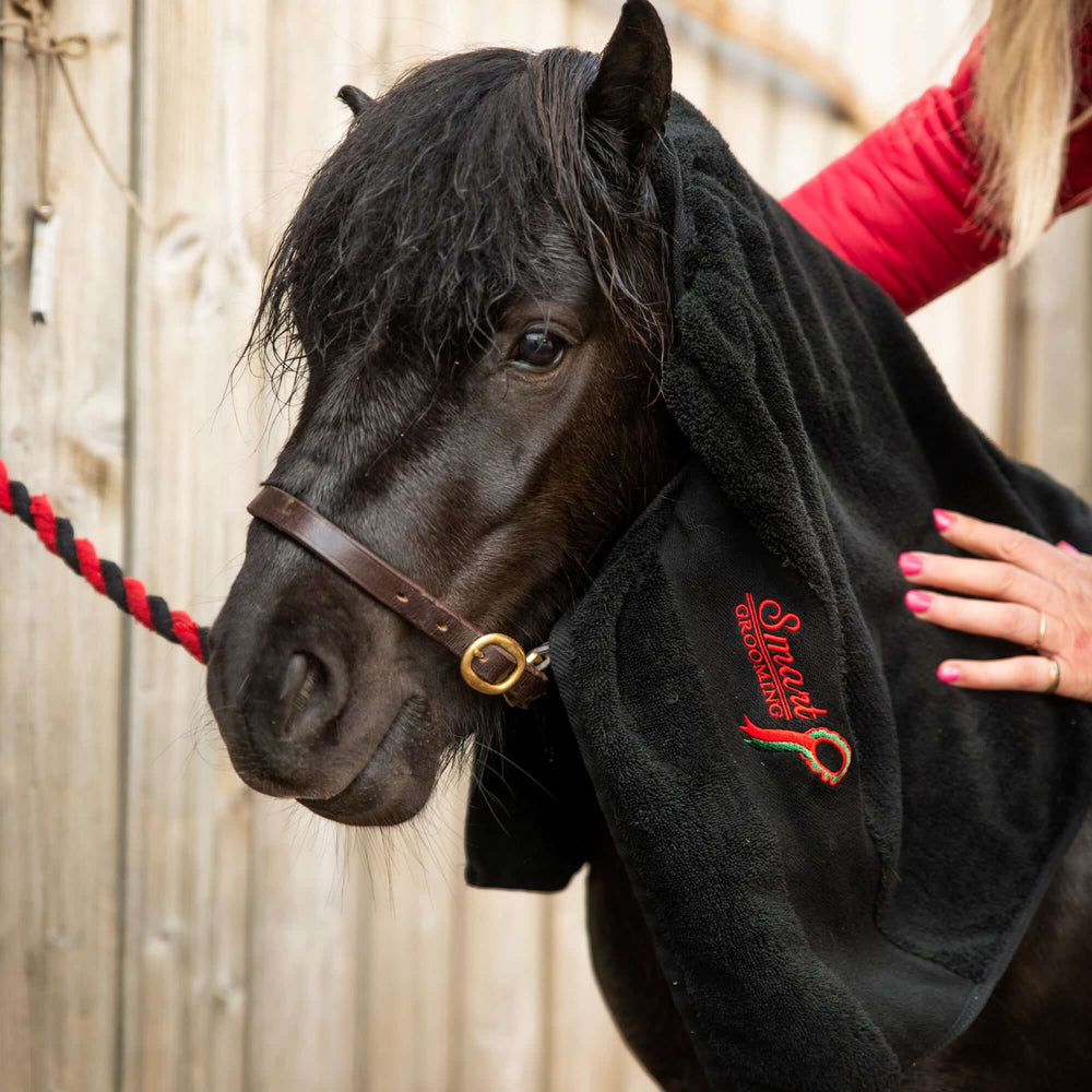 Das Smart Grooming Dry Off Towel für Pferde ist ein super saugfähiges, hochwertiges Handtuch aus 100 % Baumwolle (550 g). Die rechteckige Größe erleichtert das Abtrocknen der Beine und eignet sich perfekt zum Abtrocknen des gesamten Körpers. Ein unverzichtbares und praktisches Zubehör für das Pflege- und Waschset.